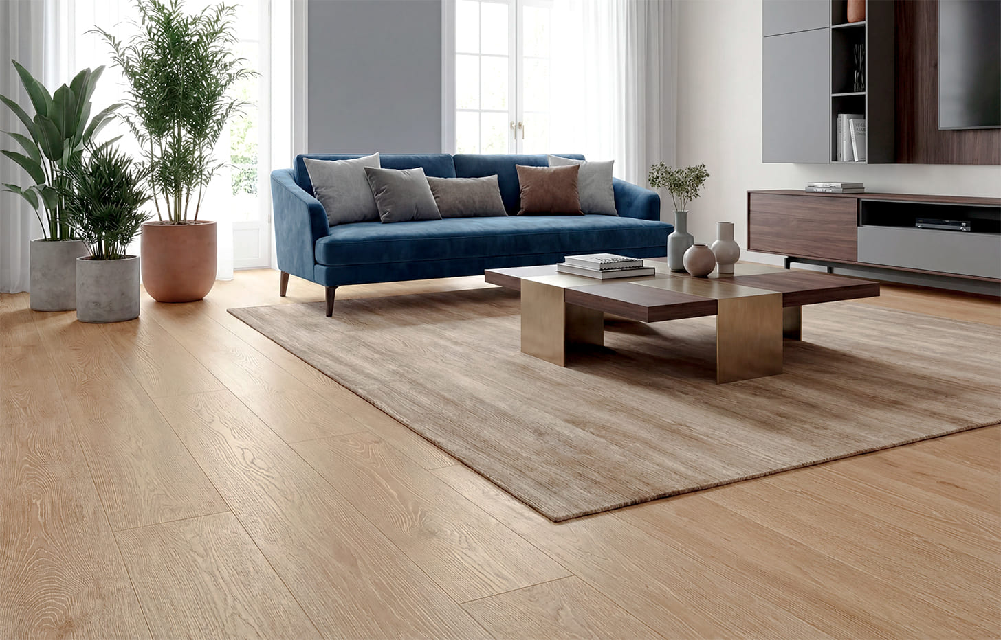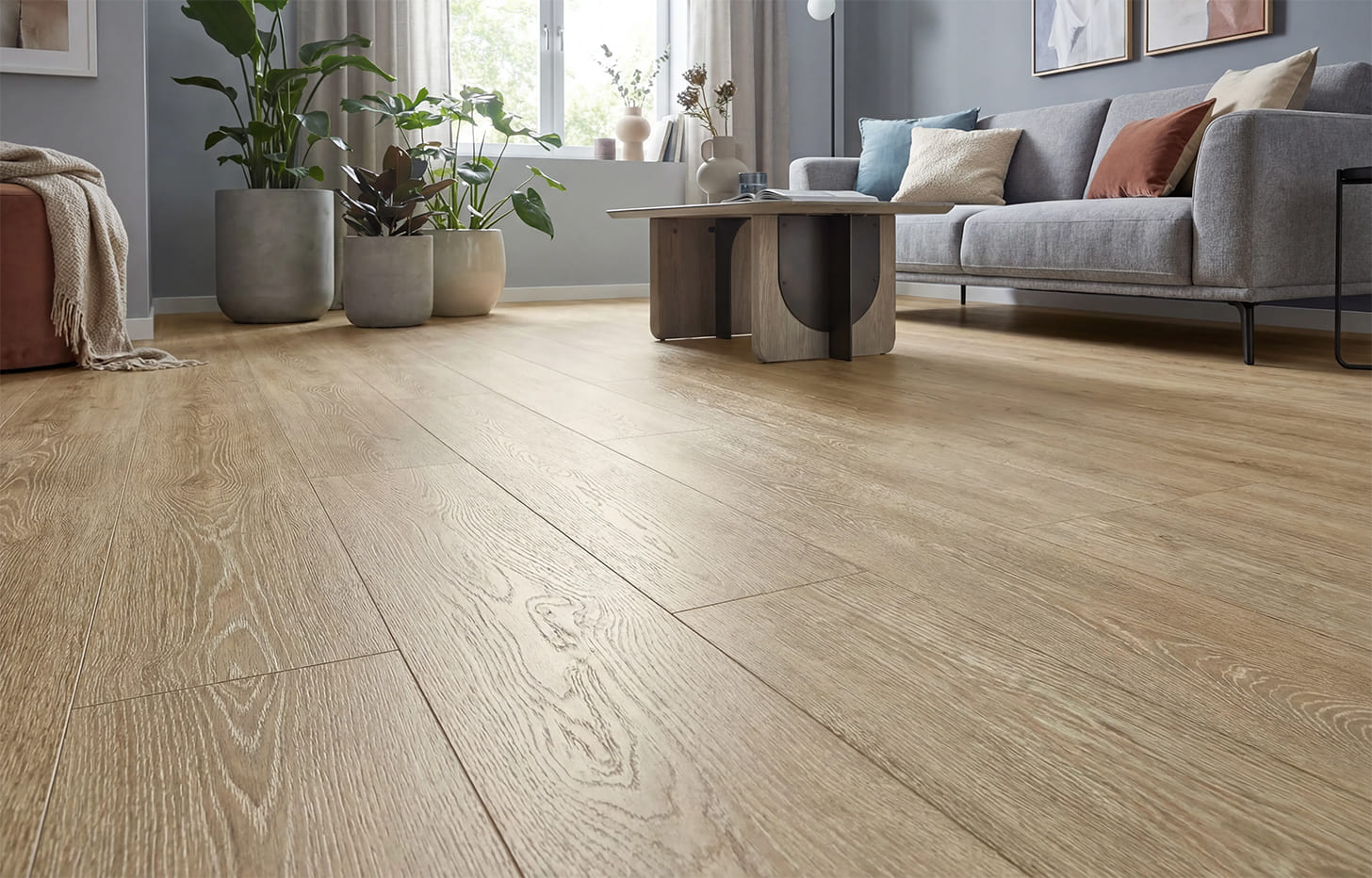 Минерально-каменный ламинат Дуб Летнее Утро — это водо и термостабильные полы цвета золотистой пшеницы. Оттенок дуба богатый, спелый, плодородный. Удачно сочетается как с холодными серыми оттенками, белым, так и с коричневыми цветами. За счет широкого формата доски усиливается ощущение натуральности и аутентичности. Каждая доска имеет тиснение в регистр и выразительную V-образную фаску. Дуб Летнее Утро довольно универсален и легко интегрируется как в городские, так и в загородные интерьеры.